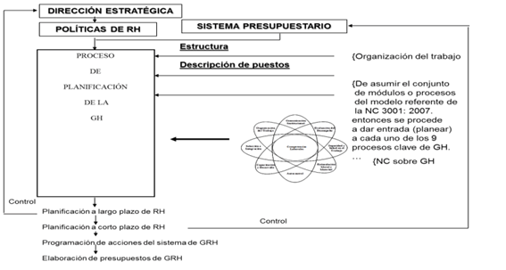 Y las conceptualizaciones relativas al tercer componente de la tecnología, el “accionar de la GRH en la empresa”, se asociaron a un modelo conceptual, advirtiéndose la necesidad de ubicar ese “accionar” en el entramado de un sistema de GRH reflejado por un modelo, que responda al ciclo de diagnóstico, planeación, y control de la GRH consecuente con la estrategia trazada. El “accionar de la GRH en la empresa”, es comprendido en un conjunto de procesos clave como se refleja en la Figura 1.