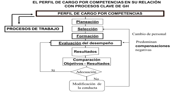 Adviértase de la lógica de la Figura 5, que la existencia del perfil de cargos por competencias es la base del conjunto de procesos clave de GRH que deberán desarrollarse (donde se refleja su interacción con los procesos de trabajo, de donde salen respondiendo a los mismos las divisiones significadas por los distintos cargos o puestos de trabajo). No se podrá hacer la planeación -que implica determinar la plantilla-- si no disponemos de los perfiles de los diferentes cargos (operario, tornero, carpintero, auxiliar de servicio, etc.), pues no se trata de la determinación de la cantidad de empleados de la empresa, sino de la cantidad de empleados a determinar para los diferentes cargos de la empresa, de operarios, torneros, etc. No se podría realizar el proceso de selección de personal si desconocemos las competencias laborales y otros requisitos exigidos para desarrollar determinado cargo, lo cual debemos identificar en las personas a seleccionar, etc.