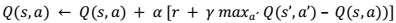 QL es un algoritmo del AR que se basa en la capacidad de aprendizaje de los agentes asociados al método. Este algoritmo trabaja aprendiendo de una función acción-valor que da la utilidad esperada de tomar una acción en un estado determinado. El núcleo del algoritmo es la actualización de un q-valor en cada iteración. Cada par estado-acción (s,a) tiene un q-valor asociado. Cuando la acción es seleccionada por el agente que se encuentra en un estado determinado, el q-valor para ese par estado-acción es actualizado en base a la recompensa recibida cuando se seleccionó esa acción y el mejor q-valor para el subsiguiente estado. La regla de actualización para cada par estado-acción es la siguiente:
