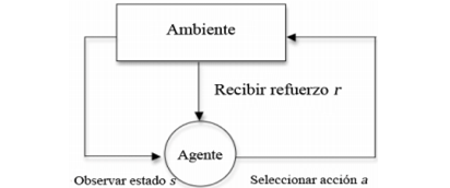 En el paradigma del AR un agente se conecta a su ambiente mediante la percepción y acción, como lo descrito en la Figura 1. En cada paso de la interacción, el agente percibe el estado actual “s” de su ambiente y selecciona una acción “a” para cambiar este estado. Esta transición genera una señal de refuerzo “r”, que es recibida por el agente. La tarea del agente es aprender una política de elección de acciones en cada estado, que le posibilite recibir un número máximo de recompensas acumuladas. Los métodos del aprendizaje reforzado exploran el ambiente todo el tiempo para obtener una política deseada [28].