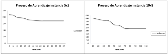 La figura 2 muestra el proceso de aprendizaje en la solución de la instancia 5x5 y 10x8 con la combinación de parámetros escogida. Las soluciones para dichas instancias son Cmax = 172 y Cmax = 241 respectivamente.