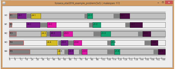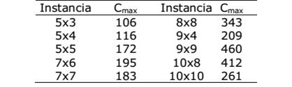 El algoritmo QL fue implementado en Java, se ejecutó en una PC con un Corei3 a 3.4 GHz y 2 GB de memoria RAM. La Figura 3 muestra la solución de la instancia 5x5 donde el Cmax = 172 a través un diagrama de Gantt. La Tabla 6 muestra los valores de Cmax para las 10 instancias.