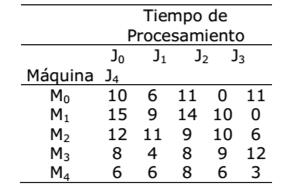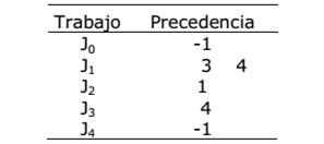 La tabla 3 es interpretada como el tiempo que se necesita para configurar una máquina una vez que termina de procesar un trabajo y comenzar a ejecutar otro. En la tabla 4, el valor -1 significa que el trabajo no depende de la culminación de otro para comenzar su procesamiento. En caso contrario, el mismo deberá esperar por el procesamiento total de los trabajos que se especifican. Como se describe en la tabla 1, J3 no es procesado por M0. De igual manera, J4 no es procesado por M1. Por otra parte, en la tabla 4 se muestra que J1 debe esperar a que culmine el procesamiento de J3 y J4, además, J2 debe esperar por J1y por último, J3 debe esperar por la ejecución de J4.