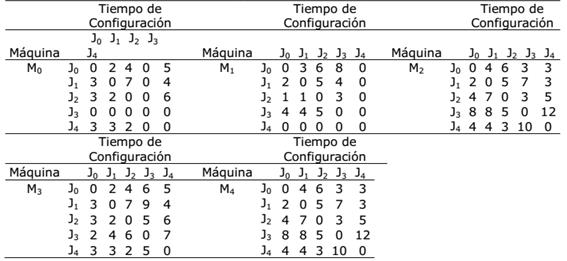Al no existir instancias disponibles de problemas que contemplen las restricciones presentes en este artículo, los datos para los experimentos computacionales fueron generados aleatoriamente. Para comprobar la calidad de los resultados obtenidos se usaron 10 instancias de diferentes tamaños y complejidad que sirvieron para ejecutar el algoritmo propuesto. El tamaño de las instancias fue de 5x3, 5x4, 5x5, 7x6, 7x7, 8x8, 9x4, 9x9, 10x8 y 10x10 respectivamente. Se generaron números aleatorios para crear los tiempos iniciales de preparación de las máquinas y los tiempos de configuración entre trabajos. La tabla 1 muestra los tiempos de procesamiento de cada trabajo por máquina. La tabla 2, por su parte, detalla los tiempos de preparación inicial de las máquinas. La tabla 3 muestra los tiempos de configuración entre trabajos en cada una de las máquinas. Por último, la tabla 4 muestra la precedencia entre trabajos. Todos los datos mostrados en las siguientes tablas corresponden a la instancia 5x5.