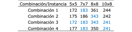El comportamiento no determinístico de los algoritmos sobre múltiples conjuntos de datos es una razón por la cual no existe un procedimiento establecido para poder compararlos. Distintas técnicas estadísticas son utilizadas para tratar de determinar si las diferencias encontradas entre dos algoritmos son significativas. Debido a la no disponibilidad de problemas que contemplen las restricciones presentadas en el problema que se analiza en este artículo solo se realizó una comparación entre los rendimientos de cada combinación para las instancias propuestas y así determinar cuál de ellas tiene mejor desempeño. Para esto se tuvo en cuenta la moda de Cmax obtenida después de 10 ejecuciones para 4 instancias escogidas aleatoriamente. La tabla 5 muestra estos resultados.