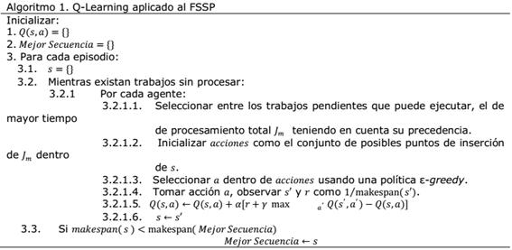 Se implementó un algoritmo basado en el Aprendizaje Reforzado denominado Q-Learning. Esta metodología fue adaptada al FSSP teniendo en cuenta un conjunto de características que se presentan en entornos reales de la producción. La misma fue evaluada con diez instancias de prueba de dicho problema proporcionando excelentes secuencias de scheduling. De acuerdo a los resultados obtenidos se llega a las siguientes conclusiones:
