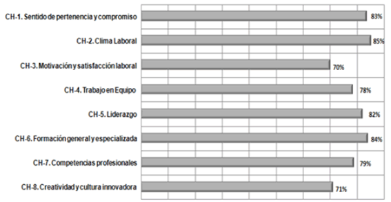 Las variables de capital humano que recibieron mayor reconocimiento de los empresarios cubanos fueron: clima laboral; formación general y especializada; sentido de pertenencia y compromiso con la organización; liderazgo; competencias profesionales; y trabajo en equipo. Sin embargo, variables como motivación y satisfacción laboral; y creatividad y cultura innovadora fueron desestimadas por el 30% de los empresarios (ver figura 1).