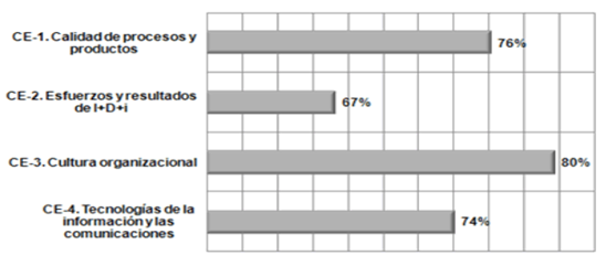 En la figura 2 se muestra que la variable de capital estructural más reconocida es la cultura organizacional con un 80 %, seguida de las variables relacionadas con la calidad de los procesos y productos con un 76 % y las tecnologías de la información y las comunicaciones con un 74%. Resulta inquietante constatar como un factor tan importante y decisivo para el desarrollo empresarial como es la investigación y la innovación sea reconocido solamente por el 67% de las empresas.