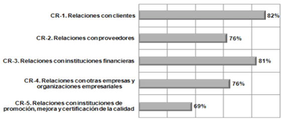 En el capital relacional la mayor valoración pertenece a las variables asociadas a las relaciones con clientes e instituciones financieras con un respaldo del 80% de los encuestados. La variable menos reconocida fue las relaciones con instituciones de promoción, mejora y certificación de la calidad con un 69 % (ver figura 3).