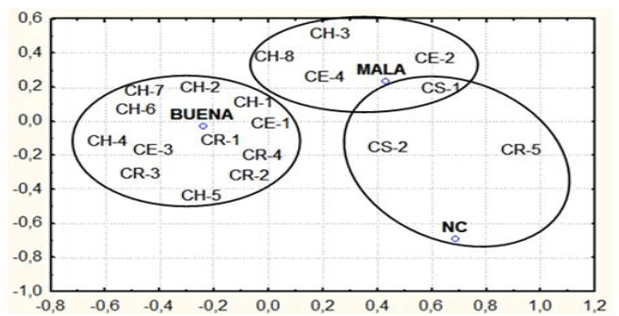 Para este estudio se utilizó la técnica estadística de análisis de correspondencias con el fin de determinar la calidad de la gestión de los factores intangibles en 135 empresas de La Habana. Las variables fueron agrupadas en tres categorías según su gestión: buena gestión, mala gestión y no gestionadas (NC). Los resultados se muestran en la figura No. 5 y tienen un grado de confiabilidad de un 97 %, lo cual representa que ha sido procesada la mayoría de los datos suministrados.