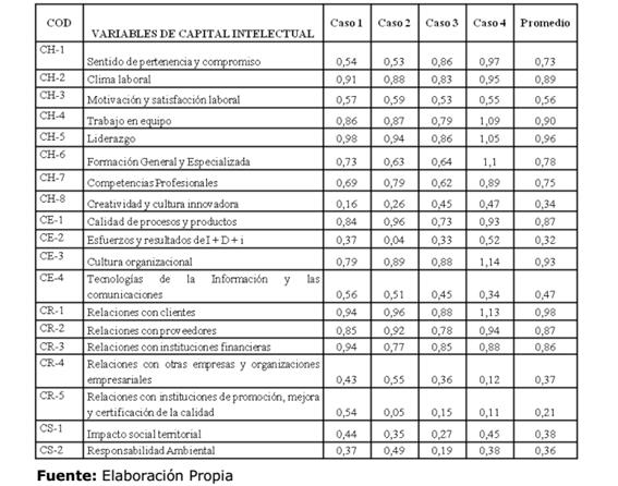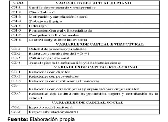 En la tabla 1 se muestran las 19 variables de capital intelectual que fueron validadas por los 210 empresarios encuestados: 8 variables de capital humano (CH), 4 de capital estructural (CE), 5 de capital relacional (CR) y 2 de capital social (CS).