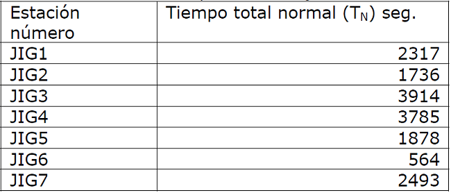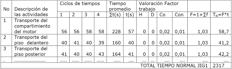 En el registro de tiempos normales se toma 4 tiempos en cada una de las estaciones, iniciando en el JIG 1, seguido se efectúa una sumatoria para luego determinar el tiempo promedio que es la suma de los tiempos anteriores dividido para cuatro. Luego de registrar los valores de Habilidad(H), destreza (D), condiciones de trabajo(Co) y finalmente la consistencia de los datos (Con), de acuerdo a la escala de Westinghouse, siguiendo el orden de la tabla 2 se calcula el factor (F) que es igual a 1 más la sumatoria de los valores de H, D, Co, Con. Con lo anterior, finalmente se calcula el tiempo normal (TN) que es igual al producto del tiempo promedio y el factor de valoración de Westinghouse, para detalle de este proceso se registra en la tabla 2 que ilustra la forma de cálculo del tiempo normal.