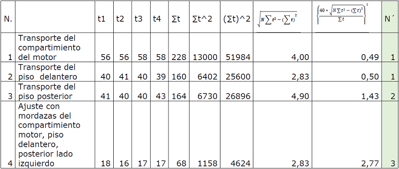 Las acciones señaladas en las tablas siguientes con sus respectivos tiempos (toma de tiempos en un total de cuatro en diferentes días, horas de trabajo, pero con el mismo trabajador) son resultado de una persona calificado debido a que la empresa dentro de su programa de capacitación en jornada completa realiza durante dos meses dicha capacitación, de tal forma que el individuo tiene las habilidades necesarias y suficientes para operar por primera vez este trabajo en la empresa como lo es la construcción del automóvil en el área de soldadura, a continuación se da conocer los resultados obtenidos del estudio in situ en las instalaciones de la planta: