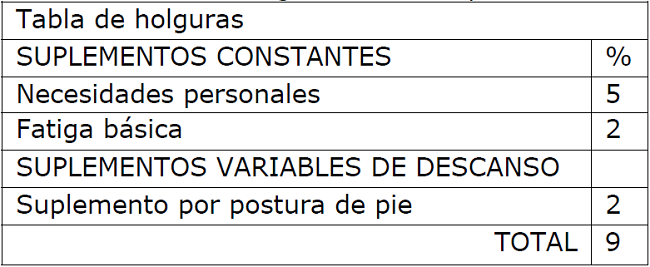 El tiempo estándar se determina efectuando el producto del tiempo normal con uno más las holguras entre las que se considera: las necesidades personales 5 %, fatiga del trabajador 2 %, suplemento postura de pie 2 %.Valores que requiere un trabajador calificado y capacitado en realizar una actividad a ritmo normal, la tabla 5 ilustra las holguras mínimas en el área de soldadura.
