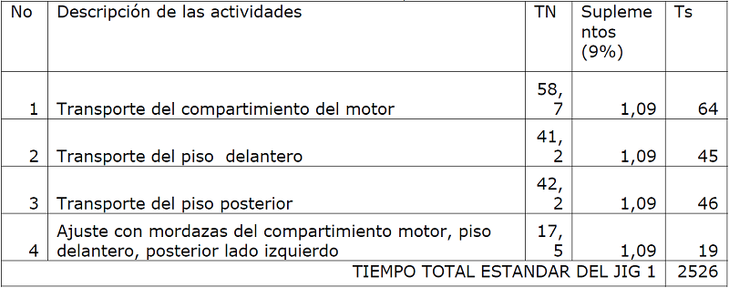 RESUMEN: El estudio se realiza en el área de soldadura en la Empresa Ciudad del Auto (CIAUTO) para el automóvil modelo cuatro (M4), donde se identifican las actividades en cada una de las siete estaciones de trabajo. En cada una de las estaciones, utilizando recursos audiovisuales, se hace: la medición, cálculo y registro de los tiempos normales, tiempos estándar utilizando como factor de desempeño de trabajo sobre la base de las tablas de Westinghouse, cálculo de los suplementos de trabajo, valores propios de la Empresa. Se obtuvo que 18191 segundos, un takt time de 2730 segundos con una demanda en ese período de 10 unidades. Con los tiempos estándar se realiza los diagramas de precedencia para con ellos determinar el balanceo de línea y la correspondiente asignación de trabajo con un total 10 personas, debido a que se tiene que realizar las operaciones sincrónicamente planificadas tanto en el lado derecho como izquierdo del auto.