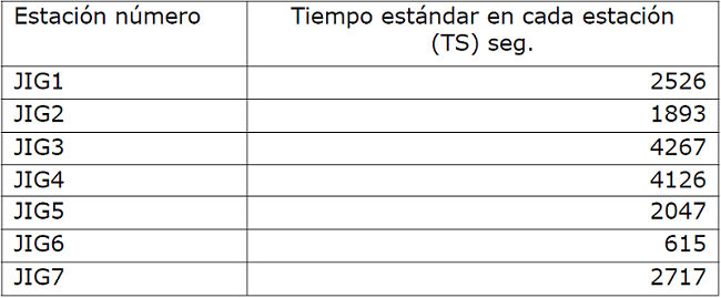 El cálculo teórico del número de estaciones es la razón entre la suma de los tiempos de todas las actividades 18191 minutos / unidad para el takt time determinado, que es 2730 segundos/unidad determinando un valor de 7 estaciones que significa que se comprueba los valores determinados con los puestos ya construidos. Esto se refleja en la ecuación 6.