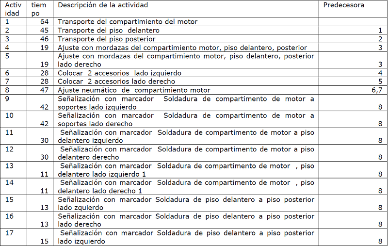 De las hojas de instrucciones de trabajo se elabora el diagrama de procesos del ensamble del automóvil en el área de soldadura [21]. Su desarrollo se observa en la tabla 1, donde se registra las actividades en el proceso de soldadura del automóvil, detallado con la minuciosidad el proceso de armado de la estructura metálica de la carrocería del modelo de automóvil.