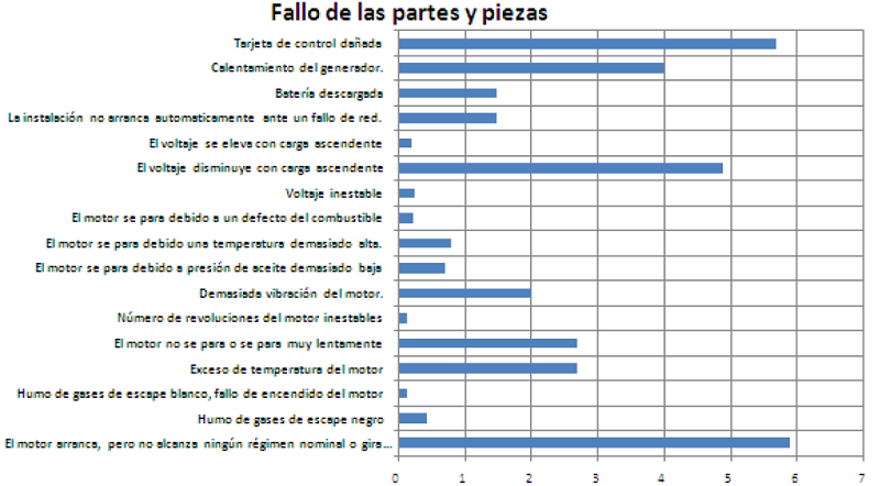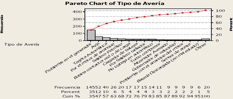 En el gráfico 2, se muestra la utilización del diagrama Pareto, con respecto a la incidencia de las averías analizadas. El diagrama muestra que el 20% de las averías están asociadas a los problemas con el generador, el dispositivo AVR y las tarjetas Automáticas, este 20% no genera el 80% de las dificultades en las roturas pero son aspectos a analizar para la conformación del plan de mantenimiento y en la reservas de almacenes de la entidad.