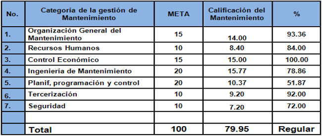 Se evidencia que la valoración final de forma cuantitativa es de 79,95 puntos como se muestra en el estado de las áreas funcionales. Asociado a ello una valoración cualitativa de Regular y el nivel de concordancia entre el estado actual y la meta de las áreas funcionales del mantenimiento.
