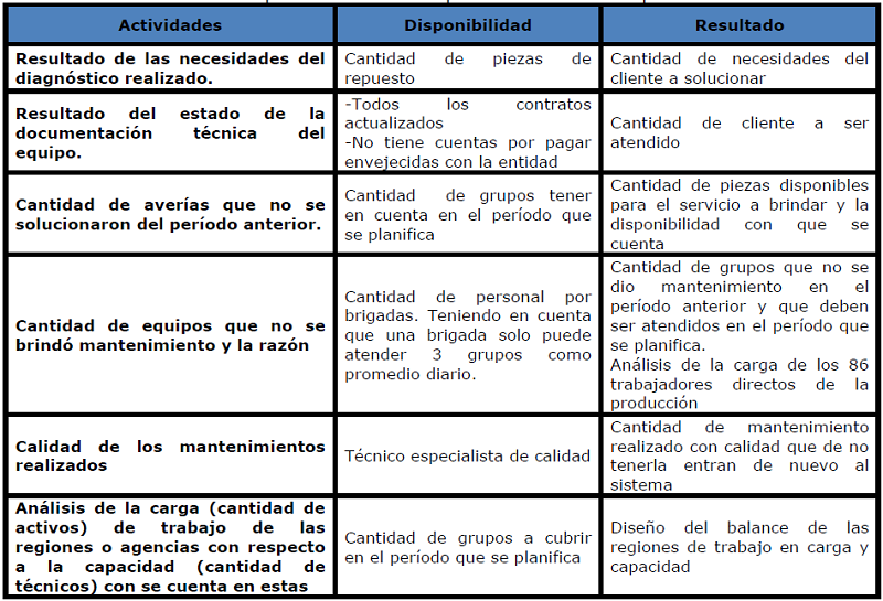 Esta etapa permite conocer la situación actual de la actividad de mantenimiento en la entidad, conociendo la cantidad y calidad de los activos que se dejan de atender, además, de las necesidades de materiales y otros recursos, que sería la entrada para la etapa 2, nombradabalance de lasnecesidades con disponibilidad.