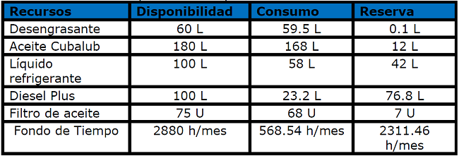 Después de analizar las restricciones se procede al análisis de los recursos materiales necesarios para cumplir con el mantenimiento en el período que se planifica. Los recursos materiales calculados teniendo en cuenta las prioridades y las metas asociadas al sistema. Se muestran a continuación en la tabla 5, recursos y reservas de productividad resultado del modelo, los mismos formarán parte del plan de mantenimiento a los activos.