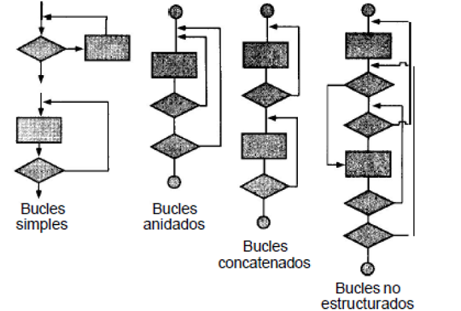 La prueba de Bucles se centra exclusivamente en la validez de las construcciones de bucles. Como se observa en la Figura 1 se pueden definir cuatro clases diferentes de bucles: simples, concatenados, anidados y no estructurados [2,13]. Los fallos en un bucle suelen existir en su condición de salida, esta condición, que puede provocar que el bucle se ejecute una vez más o una vez menos de lo esperado, por tanto es importante que sea muy bien analizada [2].