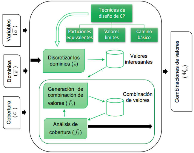 El Grupo de Calidad de Software de la Universidad Tecnológica de La Habana, “José Antonio Echeverría”, CUJAE; trabaja hace varios años en el tema y en particular en las actividades relacionadas con las pruebas de software [25,26,27,28,29].Dicho grupo ha definido un modelo para la generación de casos de prueba a partir de diferentes entradas y que genera código de pruebas en diferentes lenguajes [23,24]. Los modelos de optimización implementados y las diferentes funciones de transformación para pruebas funcionales se describen en [20,30].En Fernández (2016)se define un modelo de optimización para la reducción de combinaciones de valores de pruebas unitarias, expuesto gráficamente en la Figura 2; y del cual se han automatizado un conjunto de procesos que se encuentran dentro del Componente para la Generación de Casos de Pruebas Unitarias (GeCaP) [24]. En este trabajo se expone como uno de sus aportes fundamentales la reducción de los dominios de las variables de entrada a partir de la aplicación de técnicas de diseño de valores de prueba para determinar valores interesantes. Para ello se utiliza el vector que contiene las transformaciones a emplear para hacer discretos los dominios descritos en , que están sustentadas en técnicas de diseño de valores de casos de prueba para cada dominio diferente. De esta forma, los algoritmos heurísticos presentados en Fernández (2016) combinan solo valores interesantes, por lo que se reduce significativamente el espacio de búsqueda y con ello la cantidad de combinaciones generadas para ejecutar los casos de prueba [31].En esta propuesta solo se han considerado valores interesantes a partir de los dominios de entrada de cada variable, pero no se ha tenido en cuenta la estructura interna del código para la obtención de valores interesantes, por lo cual se obvian errores detectables a través del análisis de la lógica interna. En el artículo se reconoce este aspecto como una debilidad de la implementación del modelo y se recomienda su incorporación, en trabajos futuros, haciendo uso de técnicas como las de Condiciones y Bucles. Teniendo en cuenta lo anteriormente expuesto, este trabajo tiene como objetivo realizar una propuesta de generación de valores interesantes de forma automática para pruebas unitarias, utilizando las técnicas de diseño de Bucles y Condiciones y abarcando, inicialmente, los tipos de datos numéricos, lógicos y cadenas.