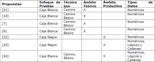 Se puede concluir que: las propuestas existentes en la bibliografía, son validadas con algoritmos específicos, y hasta donde está reportado utilizan datos numéricos únicamente, lo que limita la aplicación de estas propuestas en entornos reales de producción. No aparecen reportes de su introducción en entornos productivos, ni en aplicaciones comerciales, utilizan la técnica del Camino básico y los criterios de cobertura referidos al cubrimiento de caminos, por lo que pueden dejar valores interesantes fuera y con ellos diferentes tipos de errores. Puede ocurrir que al partir del espacio de búsqueda completo se generen algunos de los valores interesantes, pero de forma aleatoria y no intencional a partir del propio diseño del caso de prueba. Por este motivo no asegura la detección de los errores expuestos inicialmente, además, al tomar como punto de partida los dominios continuos para las variables, el conjunto de combinaciones de valores sigue sin reducirse significativamente.