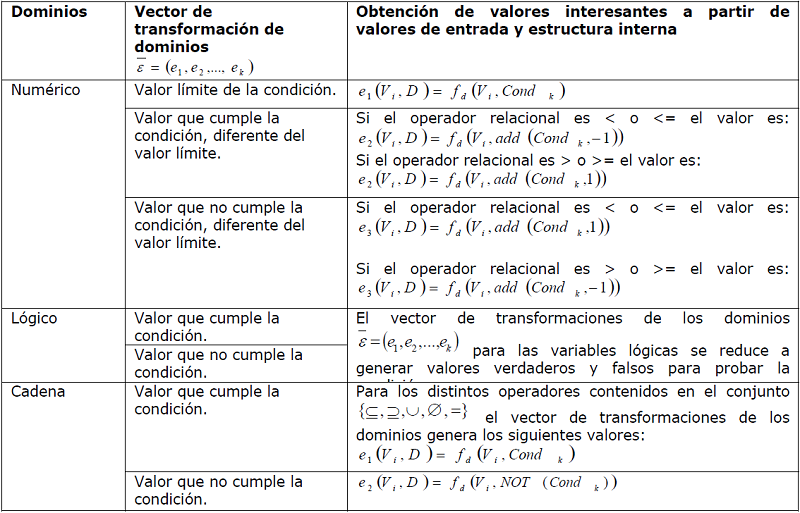 Para incorporar las técnicas de Condiciones y Bucles a la implementación del vector de transformaciones de los dominios presentado como parte del modelo de optimización descrito anteriormente. Se propone en este trabajo, un conjunto de transformaciones a realizar en el dominio de las variables de entrada, que están determinados por el procesamiento que se realiza de los bucles y las condiciones contenidas en el código que se desea probar. En las tablas 2 y 3 se muestran para cada dominio de entrada la descripción del vector de transformaciones de los dominiosy el proceso de obtención del valor, a partir de la aplicación de la técnica concreta (Condiciones o Bucles). Esta información se presenta para los tipos de datos: numérico, lógico y cadena, estableciendo de esta forma la relación entre los datos de entrada a la prueba unitaria y los tipos de errores que pueden ser detectados con las técnicas de Bucles y Condiciones, así como la forma en que se generan.