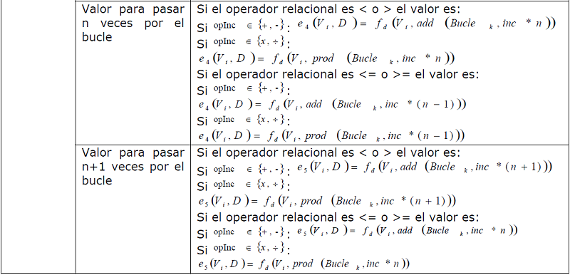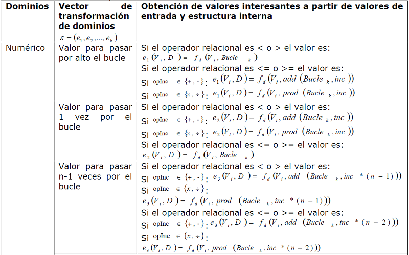 De forma similar, se obtienen los valores interesantes al aplicar la técnica de Bucles. La implementación propia de esta técnica para los vectores de transformación de los dominios se detalla en la Tabla 3. Para su comprensión se define la ecuación 6 y se especifica los términos que utiliza: