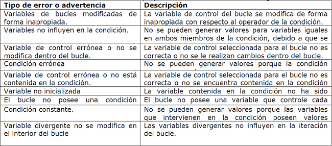 Con la obtención de estos valores se garantiza la cobertura de los errores, descritos anteriormente, que pueden ser detectados con las técnicas de Bucles y Condiciones. Se destaca que, como parte del análisis de la estructura interna y con el objetivo de aplicar estas técnicas de diseño de casos de prueba, se detectan un grupo de posibles errores y advertencias que son reportadas como salidas de los algoritmos implementados y que pueden ser de mucha utilidad. Estas serían propuestas de errores potenciales, basados en los errores expuestos, que tiene el código que se pretende probar; sus descripciones se presentan en la Tabla 4.