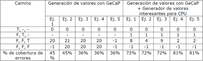 En la propia tabla se expone adicionalmente, una ejecución del componente GeCaP a partir de la integración con la propuesta. Como se puede observar, en esta ejecución se han podido satisfacer los cuatro caminos y en particular las condiciones que los determinan.