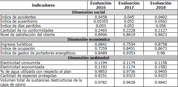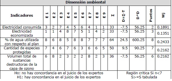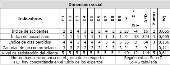 Para el cálculo de los indicadores seleccionados y su evaluación, agrupados por dimensiones, se confeccionó una ficha identificativa para cada uno, aplicándose el método de ordenación simple para asignarle peso o importancia relativa a cada indicador, según la evaluación que dan los expertos. Los resultados se muestran en las tablas 1, 2 y 3.