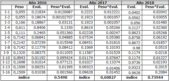 En la tabla 4 se muestra el resultado del cálculo del peso de los indicadores de riesgo en tres años de estudio.