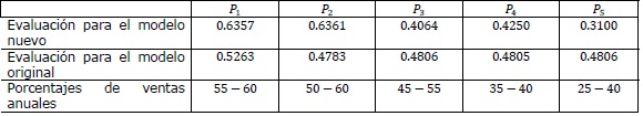 Por otro lado, de las evaluaciones generadas por el modelo original solo se puede apreciar un comportamiento notablemente consistente con los porcentajes de ventas, en el hecho de la superioridad de sobre el resto de evaluaciones. Sin embargo, todas las demás evaluaciones son demasiado similares, a tal punto que a partir de ellas no se puede establecer con confianza un orden de jerarquía bien definido entre los distintos paneles, situación que no se corresponde con la realidad del problema planteado.