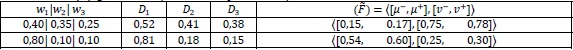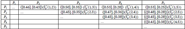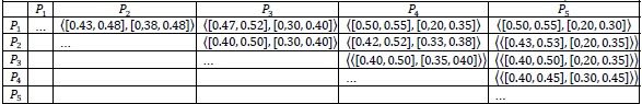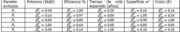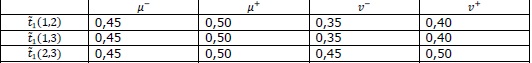 Note que el objetivo principal que se persigue en el problema es lograr un producto de mayor competencia en el mercado internacional. Por tanto, al margen de lo que piensen los decisores de cuáles serían los mejores paneles solares (alternativas), el porcentaje de ventas anuales es la manifestación directa del éxito en la venta de los paneles. De esta forma, cuando el decisor vaya a establecer los asociados a las comparaciones pareadas entre alternativas, lo lógico sería que la razón entre los grados de membresía y no membresía de los dados, sean similares a la razón entre los porcentaje de ventas anuales de los paneles que se comparan. El índice de ignorancia , debe ser mayor, cuanto mayores sean los rangos en los que se dan los valores de los porcentaje de ventas anuales de los paneles que se comparan, pues rangos más amplios significan (mayor imprecisión y desconocimiento. Teniendo en cuenta todo lo anterior, son dados los valore de por parte del decisor y estos son mostrados en la Tabla 6.
