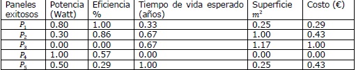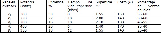 Suponga que una compañía se dedica a la fabricación y venta de paneles solares. Suponga además que su producto a perdido espacio en el mercado internacional en los últimos tiempos y que se ha decidido, por tanto, desarrollar un nuevo proyecto para fabricar nuevos paneles solares con el objetivo de que logren una mayor competitividad internacional. Para comenzar el análisis, se recopilaron datos de cinco de los paneles solares más exitosos en el mercado () asociados a algunas de las variables que se consideran que mejor pueden explicar el éxito de los mismos. Los datos se muestran en la Tabla 4.
