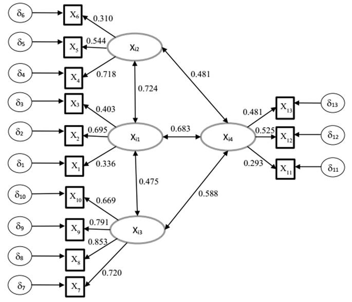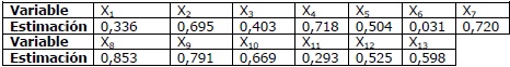 Además, se realizó el análisis de la fiabilidad para cada variable latente del modelo obteniéndose los resultados de la tabla 5. Como se observa las variables Xi1, Xi2 y Xi4 presentan un nivel de fiabilidad bajo. Estos valores no impiden el uso de los datos y pueden estar relacionados con el hecho de cada uno de los constructos sea medido por un pequeño número de ítems.