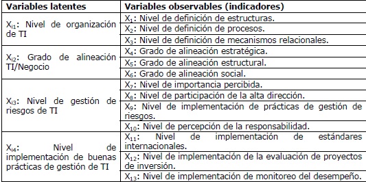 Cada una de las variables latentes y observables empleadas en la construcción del modelo teórico en la presente investigación se encuentran definidas en la investigación realizada por Pérez Lorences (2014); las variables latentes se hicieron corresponder con cada uno de los componentes que conforman la gestión de TI y se consideraron como variables observables aquellas que se creyeron más idóneas en la medición de las variables latentes [10].