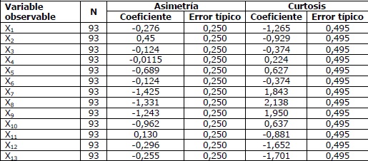 La presencia de normalidad multivariada es otro de los requisitos que cualquier conjunto de datos debe reunir para la aplicación de la mayoría de los métodos de estimación de los MEE. En primer lugar, debe satisfacerse la normalidad univariada de todas las variables, para ello se analizaron los valores de asimetría y curtosis; obteniéndose los resultados que a continuación se muestran en la tabla 2.