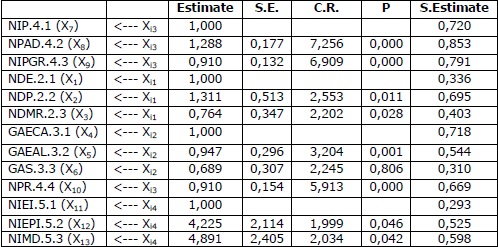 Una vez estimados los parámetros del modelo, se procedió a examinar la significación estadística de cada carga obtenida entre el indicador y la variable latente correspondiente. En la tabla 6 se muestran las estimaciones de los parámetros del modelo, el error estándar aproximado (S.E.), la proporción crítica (C.R.) y las estimaciones estandarizadas de los parámetros.
