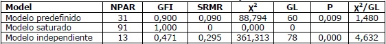 Para evaluar la calidad del modelo una vez estimados los parámetros se analizó su ajuste. Varias investigaciones como las de Agarwal et al. (2019), Ainin et al. (2016), Sharma (2018), Sica et al. (2019) muestran como en la actualidad, la combinación más extendida y utilizada de estos estadísticos es la siguiente: Chi-cuadrado (χ2), el Error de Aproximación Cuadrático Medio (RMSEA, por sus siglas en inglés), la Raíz del Residuo Cuadrático Promedio(SRMR, por sus siglas en inglés),el Índice de Bondad de Ajuste (GFI, por sus siglas en inglés) y el Índice de Bondad de Ajuste Comparativo (CFI, por sus siglas en inglés). El análisis e interpretación de este conjunto de índices resulta suficiente como para poder tomar una decisión en cuanto al ajuste del modelo en cuestión [16; 17; 18; 19].