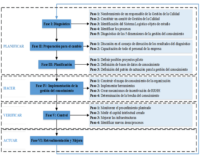 La investigación es cualitativa cuantitativa y sugiere un procedimiento adaptado de Hernández (2010)para el mejoramiento de la calidad en las cadenas de suministro de alimentos perecederos, mediante la implementación de la gestión del conocimiento, lo cual se muestra en la figura 1. El mismo adopta el principio de mejora continua a través de la utilización del ciclo Deming (Planificar, Hacer, Verificar y Actuar). El procedimiento contempla seis fases que incluyen diagnóstico, preparación para el cambio, planificación, implementación de la gestión del conocimiento, control, y plan de acción, constituyendo el núcleo del documento el análisis de las cinco dimensiones del conocimiento. Además mediante el análisis estadístico ANOVA unifactorial se pretende determinar la relación existente entre las variables: gestión del conocimiento y mejora de la calidad de las cadenas de suministros perecederos.