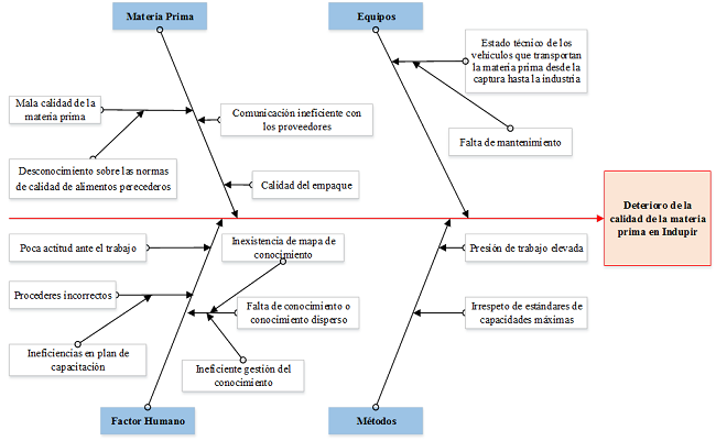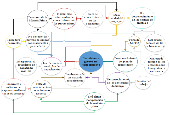Los datos se obtuvieron de los empleados de la empresa Pescaspir, la cual se dedica a las actividades de cultivo, captura (de especies marinas y acuícolas), producción, industrialización y comercialización de productos de la pesca. Se constituye el comité multifuncional (SteeringCommittee), denominado CGC (Comité de Gestión del Conocimiento), quedando conformado por siete expertos. Se efectúan otras técnicas como: la revisión documental detallada, observación detallada y entrevista a los trabajadores, el desarrollo de técnicas de trabajo grupal y de consenso en la investigación para llevar a cabo el diagnóstico previo a la implementación del procedimiento en cuestión. El grupo de expertos, rigiéndose por las tres primeras etapas del procedimiento de Noda (2015), identifica los procesos que forman parte de la cadena de suministro de alimentos perecederos objeto de estudio. Se utiliza técnica de observación directa, ya que, las causas que más influían en el efecto fueron las relacionadas al factor humano, una vez constituido el diagrama causa -efecto, como se observa en la figura 2. Se realizó un diagrama de relaciones, que permitió identificar que la causa que más se interrelaciona con las demás y por tanto la que más influía sobre el efecto, como se refleja en la figura 3. Se utilizan herramientas como la tormenta de ideas y el trabajo en equipo con los expertos seleccionados, para la obtención del resultado final, traducido en una lista de los procesos. Se propone valorar una serie de criterios de medidas tomados de Hernández (2010) para la evaluación de las cinco dimensiones de la gestión de conocimiento. Dichos criterio se miden en el proceso de captura, que es donde se reportan los mayores fallos de la cadena de suministro de alimentos perecederos objeto de estudio, según Jiménez (2015), coincidiendo con datos históricos de Pescaspir. En la figura 2 se observa Diagrama Causa -Efecto de los fallosy en la 3 un diagrama de relaciones éntrelas dificultades.
