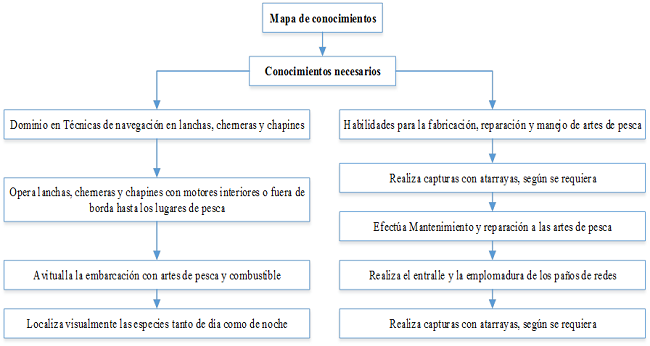 Se alcanzaron respuesta de los 77 pescadores y de los 19 choferes que transportan el pescado desde la presa hasta la industria. Se identificó mediante el diagrama de relaciones que la causa que más se interrelaciona con las demás, y por tanto, la que más influía sobre el efecto era la insuficiente gestión del conocimiento. Se determinó la brecha que existe entre el conocimiento que poseen los pescadores de la empresa en cuestión y el que realmente deberían tener, como se muestra en la figura 4. Se elaboró el mapa de conocimiento de una muestra piloto, teniendo en cuenta las competencias laborales de los trabajadores, en aras de optimizar el rendimiento de la cadena de suministro de alimentos perecederos y por ende mejorar la calidad de la cadena en cuestión, como se muestra en la figura 5.