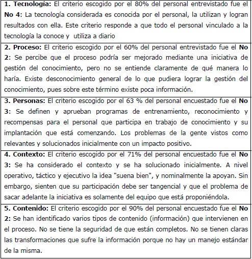 Se muestran los resultados de la entrevista aplicada a los trabajadores de la industria pesquera de Sancti Spíritus de Cuba, tomando como referencia los criterios de medidas utilizados en el paso 5 de la fase I del procedimiento, para cada una de las dimensiones del conocimiento, como se observa en la tabla 2.