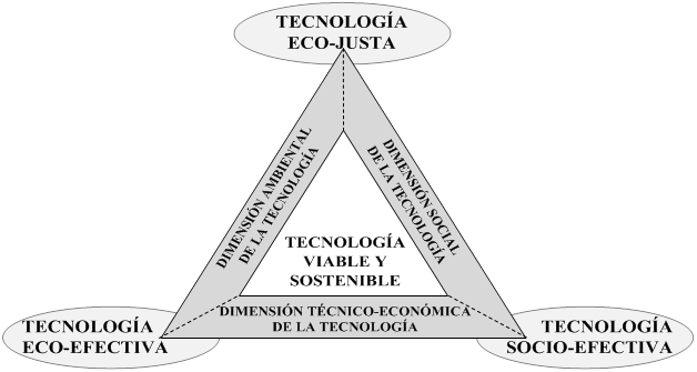 Otro aspecto de interés conceptual asociado a este tema es el referido a la equidad de las dimensiones en el “triángulo de la sostenibilidad”, a la hora de evaluar integralmente el proceso de transferencia de tecnologías. En tal sentido, se considera que este “triángulo debe ser equilátero” (refiriéndose a su forma geométrica) en concordancia con los elementos técnico-económico, ambiental y social. Así, por ejemplo, en aquellas que no sean ambientalmente compatibles, tendrían en la inmensa mayoría de los casos, la oposición de un candidato ecológico (o con “etiqueta verde”) con similares prestaciones técnico-tecnológicas en condiciones económicas que no resistirían una comparación racional. Un enfoque similar puede ser aplicado a la dimensión social, asociado a sus correspondientes variables para casos concretos.
