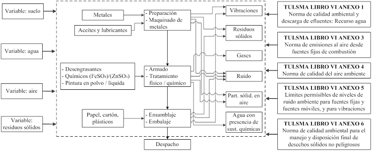 La evaluación ambiental de las OTq consideradas en la proyección estratégica de los procesos de transferencia para el plan correspondiente al periodo fijado por la PyME en cuestión, está condicionada por la normativa vigente en Ecuador según el Artículo Nº. 1 de la Ley de Gestión Ambiental. Para ello se utiliza como guía lo estipulado en el Libro VI del Texto Unificado de Legislación Secundaria del Ministerio del Ambiente (TULSMA) con carácter obligatorio, en el cual se detallan las actividades de protección ambiental que tiene que cumplir toda actividad económica, diferenciadas en siete (7) anexos que comprenden las normas técnicas ambientales dictadas y amparadas por el Acuerdo Nº. 061 del Ministerio del Ambiente (2015), contentivas de los límites máximos permisibles de las emisiones de diferente tipo que pueden provocar contaminación ambiental[28].La evaluación ambiental parte de la identificación casuística de las variables ambientales influyentes que interactúan entre los procesos productivos, el medio ambiente y su impacto provocado en la PyME, así como las normas técnicas ambientales implicadas en esta evaluación. Un ejemplo sintético de este proceder se muestra en la Figura 2 para el caso de unaPyME manufacturera metalmecánica.