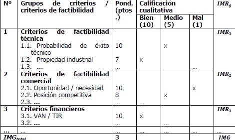 Cuando se justifica y decide aplicar métodos cualitativos, los autores antes referidos proponen la utilización de las tradicionales listas de chequeo para el cálculo de los que denominan Índice de Mérito Relativo (IMR ) y Global (IMG )[27], calculados por medio de las expresiones 3 y 4, respectivamente, a partir de la información contenida en la Tabla 1.