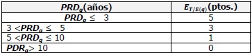 Sin embargo y según señalan Abreu Ledónet al. (2016), en aquellos casos en que el período de vida útil económica de la tecnología en cuestión, sea menor que el periodo en que se enmarca el análisis (por ejemplo, un año), se deben realizar estimaciones de inversiones futuras en estas tecnologías para permitir la comparación entre las posibles alternativas[16]. Así, el valor correspondiente a la evaluación técnico-económica [] de la opción tecnológica “q” está determinado por el Periodo de Recuperación Descontado (PRDq ). En la Tabla 2 se muestra como un referente experimental, la correspondiente, de acuerdo con el PRDq calculado para cada OTq ; no obstante, cada PyME puede adecuarla a sus necesidades específicas para la toma de decisiones al respecto.